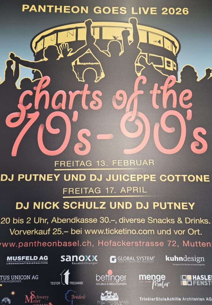 PANTHEON GOES LIVE – Charts of the 70’s – 90’s. DJ Putney & DJ Cottone. 20 bis 2 Uhr. Snacks & Drinks.