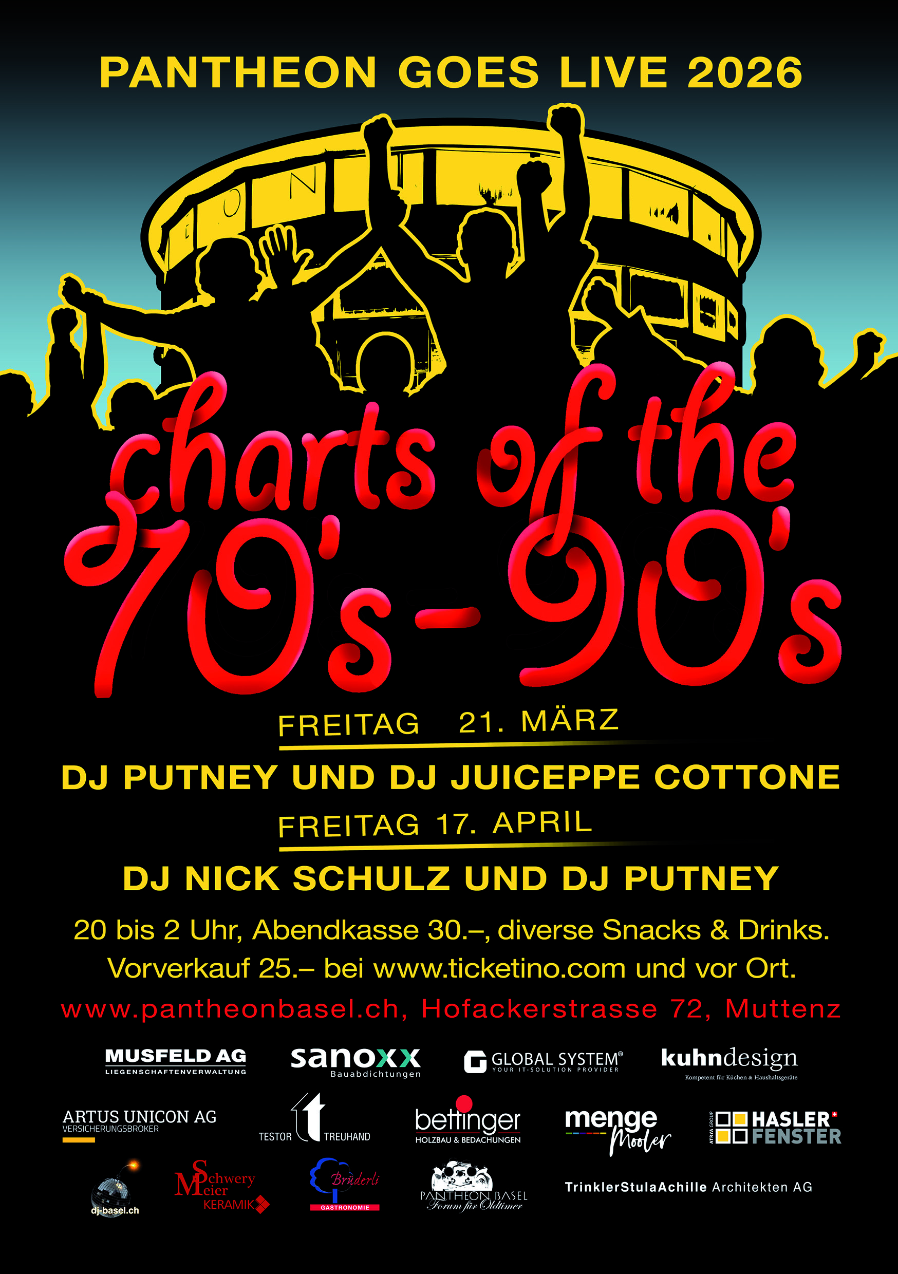 Es glitzert und dreht sich die Diskokugel in der Rundhalle des Pantheon Basel zur Musik der Charts der Siebziger bis und mit Neunziger Jahre.